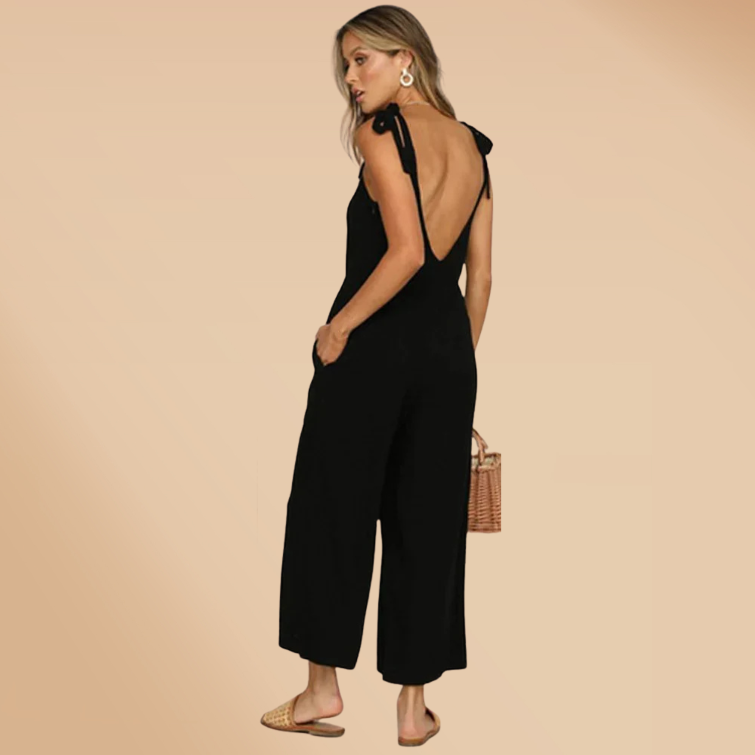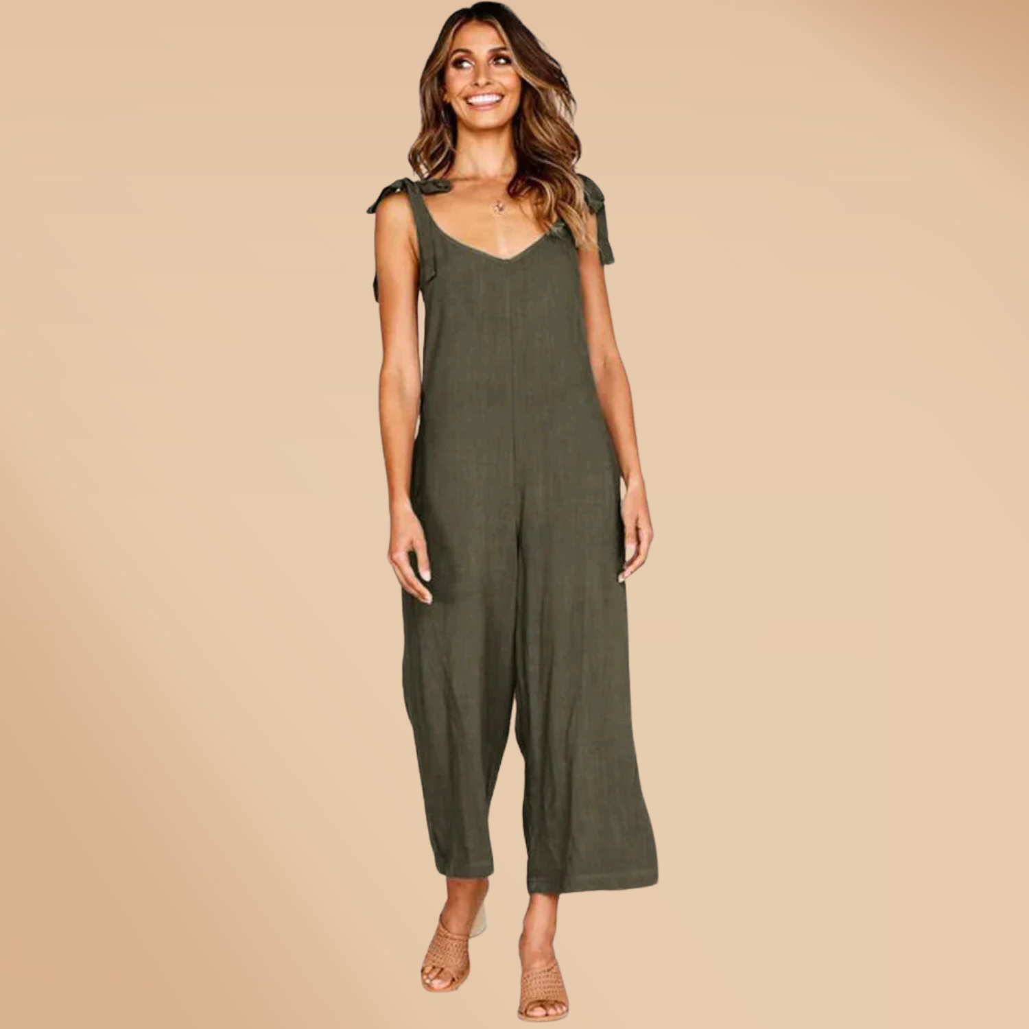 Cette combinaison fluide et légère est parfaite pour un look décontracté en vacances ou lors des journées ensoleillées. Sa coupe ample et ses bretelles fines offrent un maximum de confort et de style.