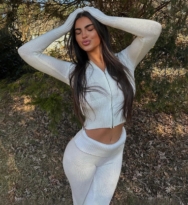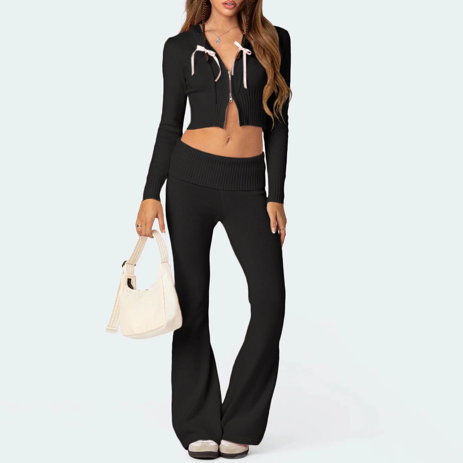 Cet ensemble en maille côtelée se compose d’un hoodie court à manches longues avec fermeture zippée, et d’un pantalon assorti à taille haute. Idéal pour les journées relax tout en restant tendance, il allie style et confort dans un look casual moderne.