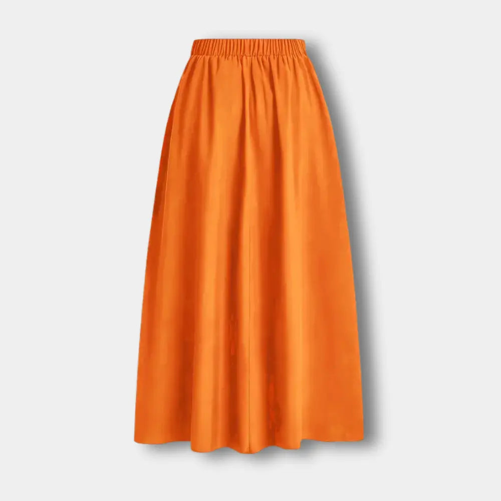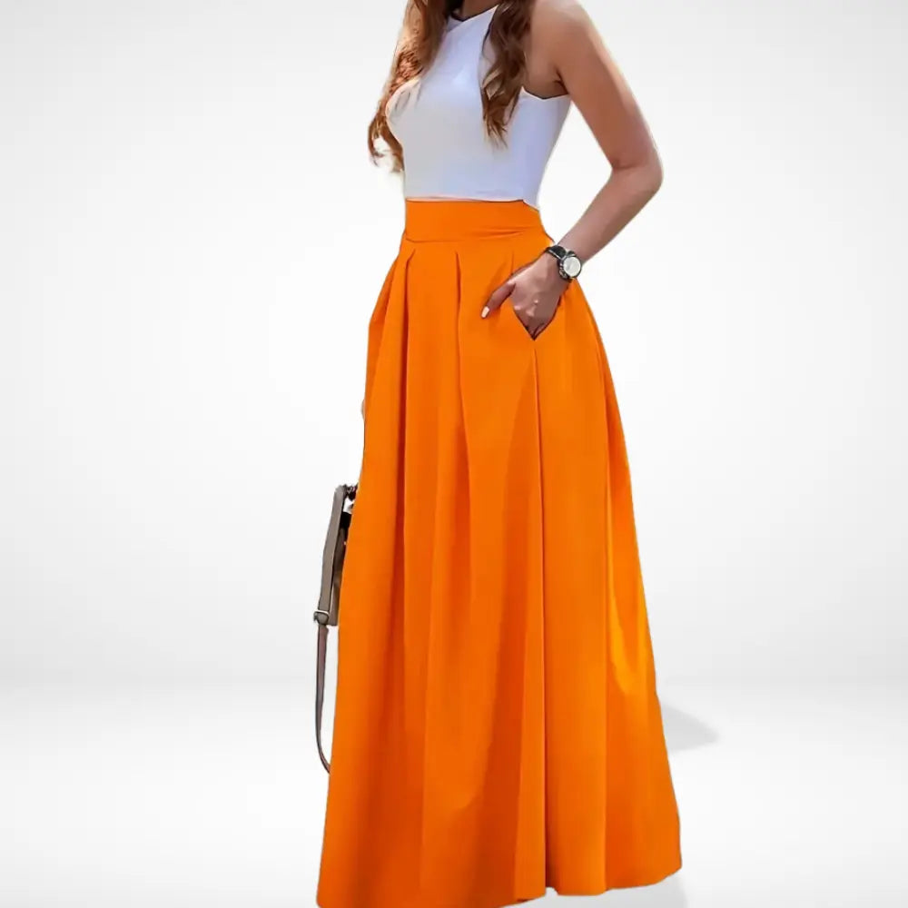 Cette jupe longue plissée offre une silhouette ample et flatteuse, idéale pour un style à la fois chic et décontracté. Ses poches discrètes ajoutent une touche pratique à ce modèle intemporel.