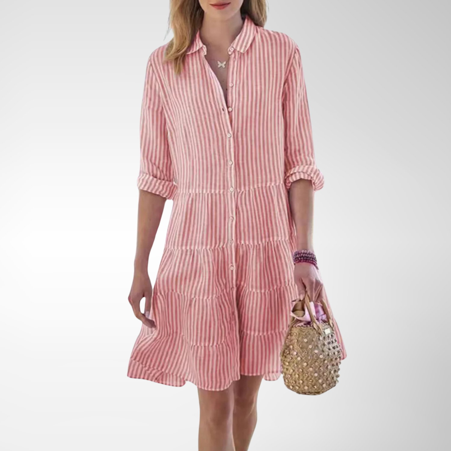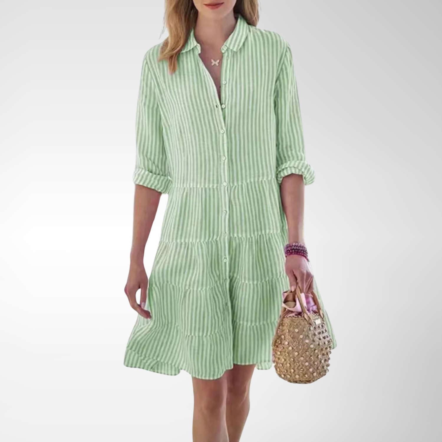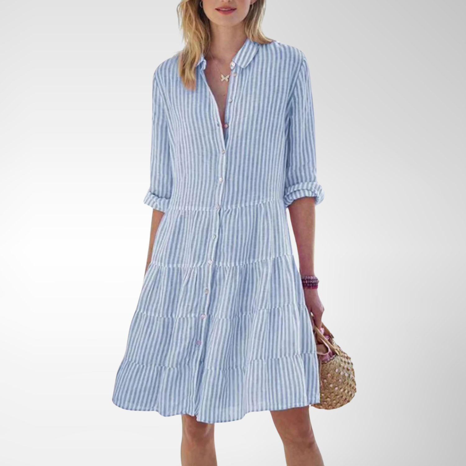 Cette robe légère à rayures verticales séduit par son design simple et son élégance naturelle. Elle est idéale pour une promenade en bord de mer ou une journée estivale décontractée.