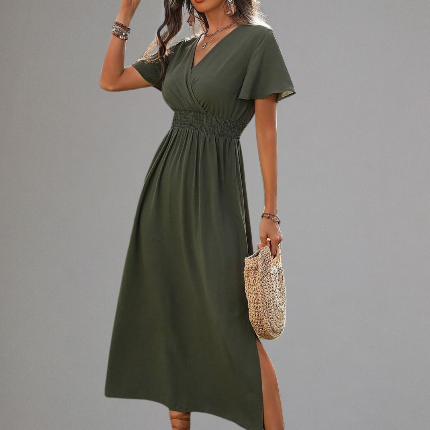 Parfaite pour vos escapades ensoleillées, cette robe longue boho séduit par son encolure en cache-cœur et sa taille smockée qui met subtilement en valeur la silhouette. Ses manches courtes fluides et sa fente latérale apportent confort et légèreté.