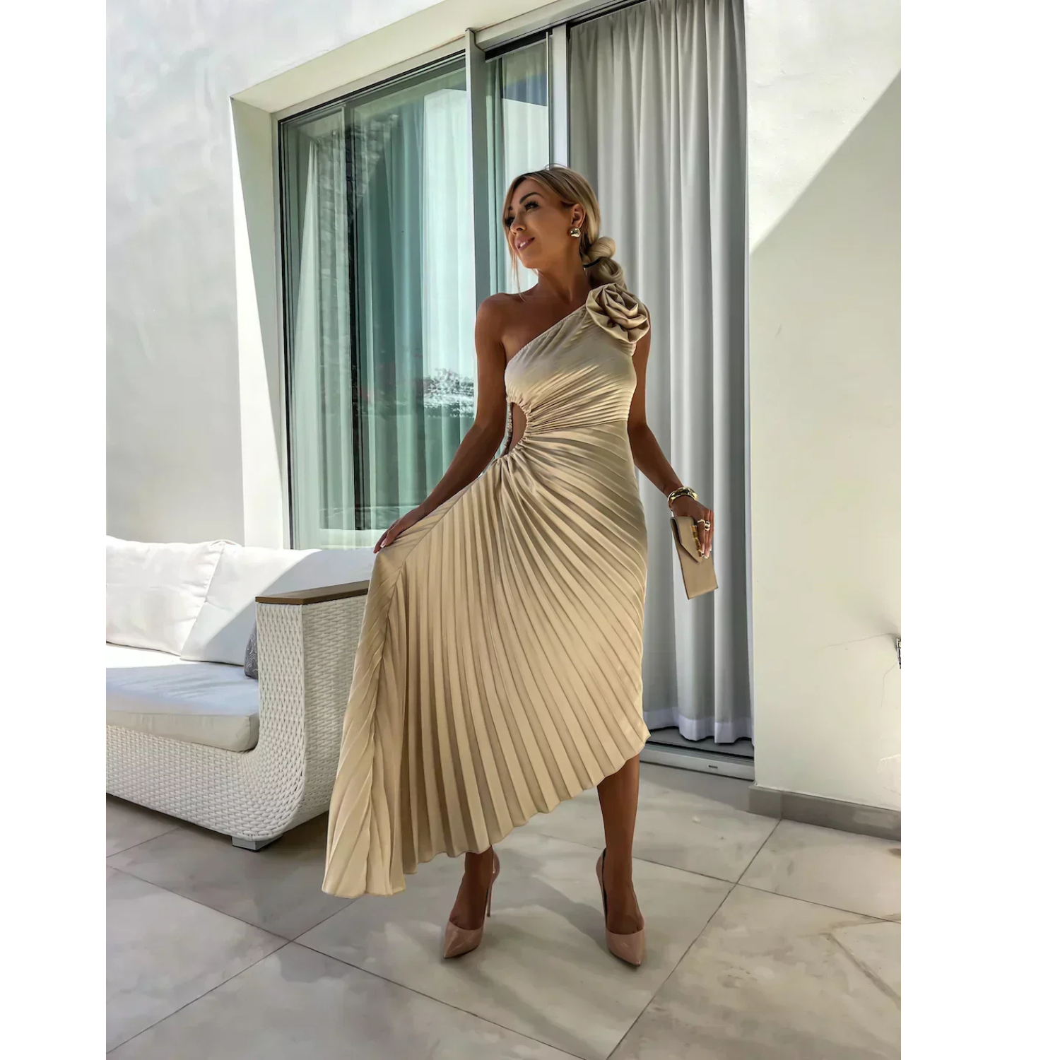 Cette robe midi à une épaule offre une silhouette raffinée grâce à ses plis délicats et son détail floral sophistiqué. Parfaite pour les occasions spéciales, elle allie style classique et modernité.