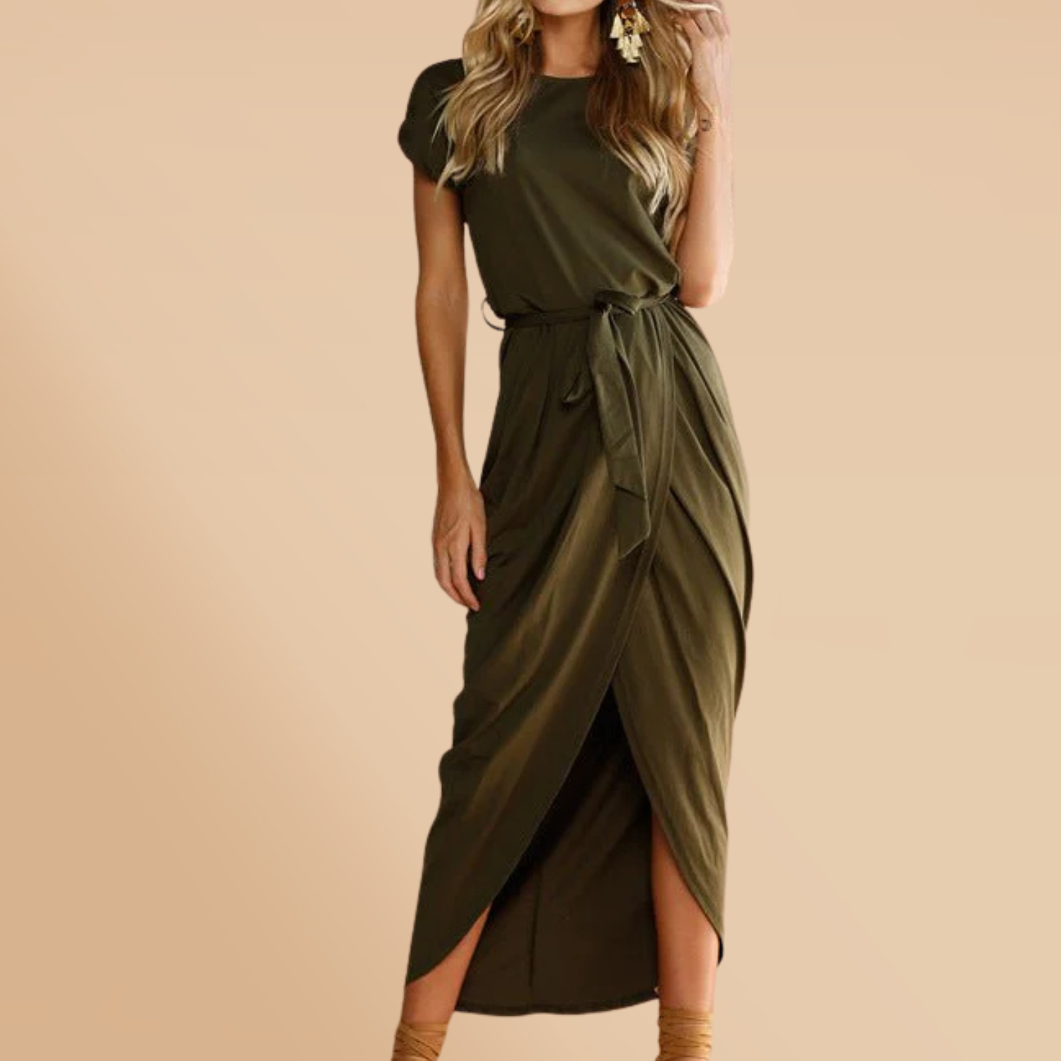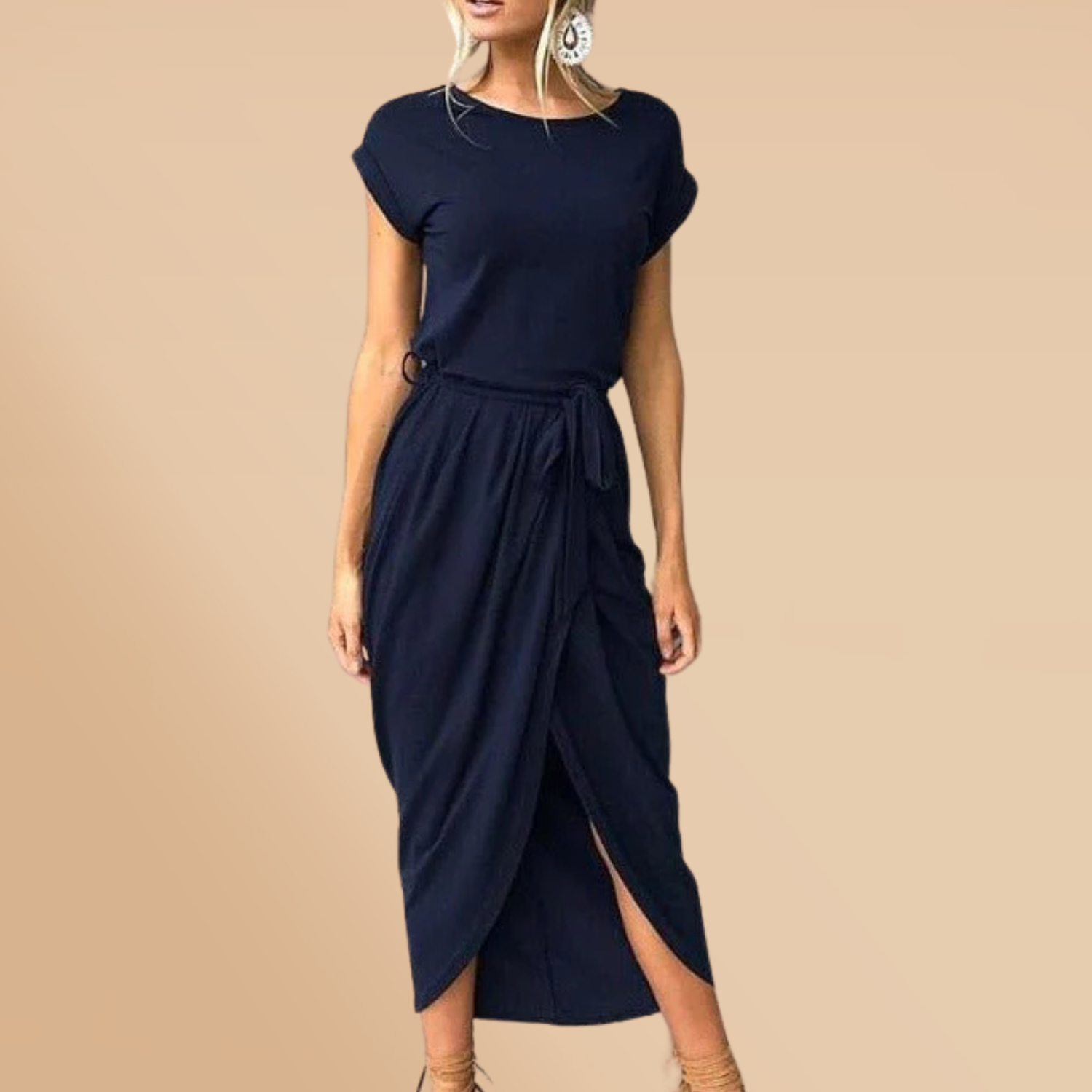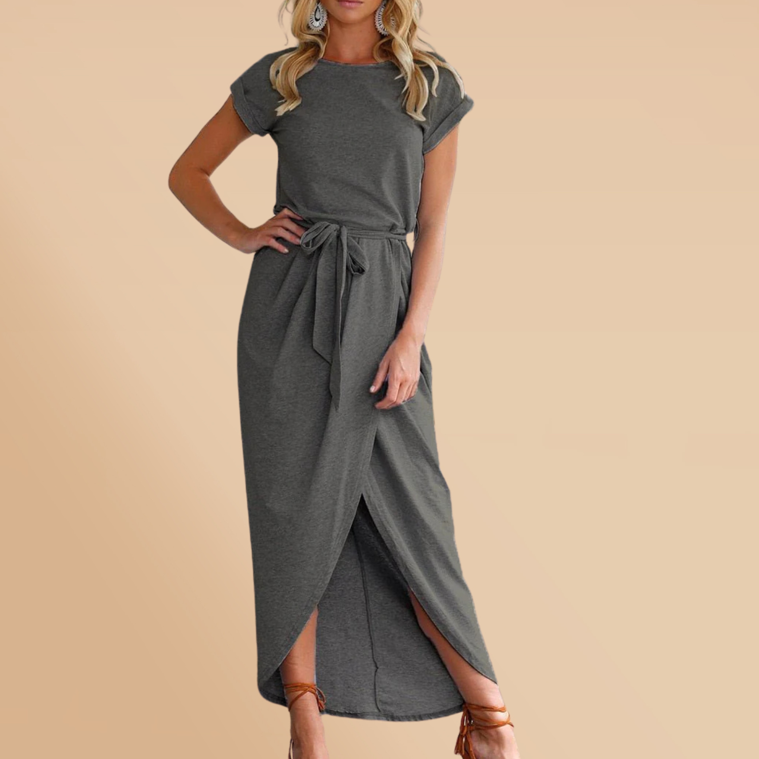 Avec sa coupe fluide et sa fente sur le devant, cette robe à manches courtes offre une silhouette féminine et moderne. Sa ceinture ton sur ton permet de souligner la taille pour un effet raffiné et décontracté à la fois.