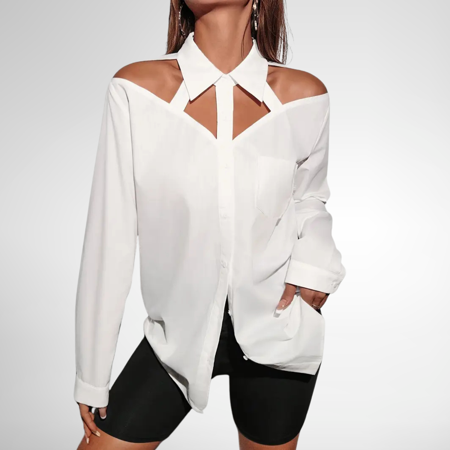 Cette chemise au design découpé met en valeur les épaules tout en conservant une allure soignée grâce à son col structuré. La boutonnière classique et la coupe fluide en font une pièce parfaite pour un look moderne et raffiné.