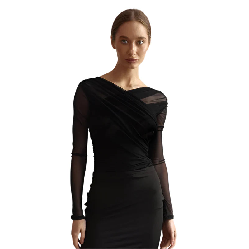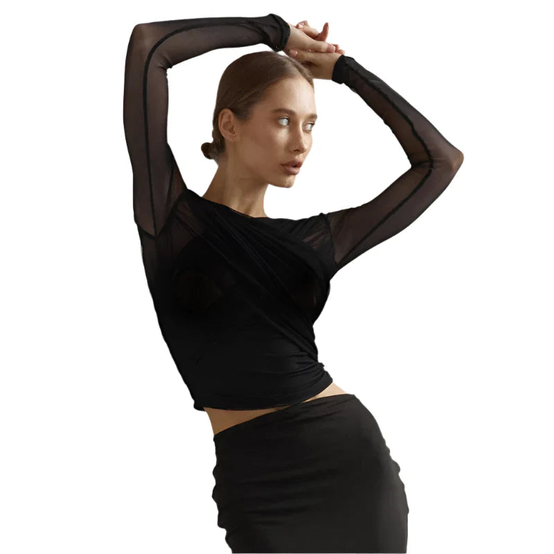 Ce crop top à manches longues séduit par son jeu de transparence et son col croisé élégant. Sa coupe ajustée met en valeur la silhouette tout en ajoutant une touche sophistiquée à vos tenues casual ou de soirée.